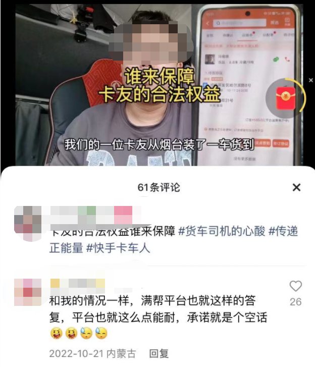 所谓“卡友”,是指相互扶持、团结互助的卡车司机群体。在卡友们聚集最多的社交媒体平台快手上,司机控诉满帮的视频屡屡出现——有的认为在满帮上接到的订单价格“低到不合理”,也有人表示被货主恶意拖欠货款、却没能得到平台的公平支持。