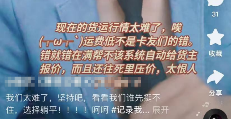 正因如此,也有一些司机将还贷的压力和怨气发在满帮等平台上,直言平台早期通过低佣金等方式让“卡友”们入驻平台、甚至通过其提供的金融服务购置车辆;而如今运价下滑,不仅令司机没有利润可赚,在还贷压力的驱使下丧失了定价主动性。