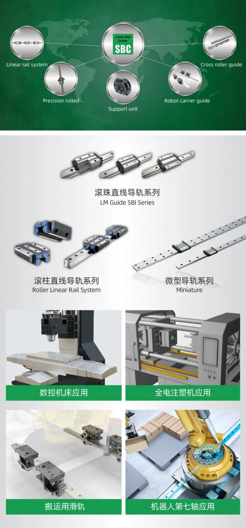 SBC公司产品主要包括:滚珠直线导轨(Ball Guide)、滚柱直线导轨(Roller Guide)、轧制丝杠和搬运用滑轨。滚珠导轨产品规格涵盖7~65mm范围,主要以自动化、机床、汽车行业应用为主;滚柱导轨涵盖15~65mm范围,主要以数控机床、注塑机行业应用为主;轧制丝杠产品规格涵盖φ12-φ63mm范围,主要以自动化行业应用为主。