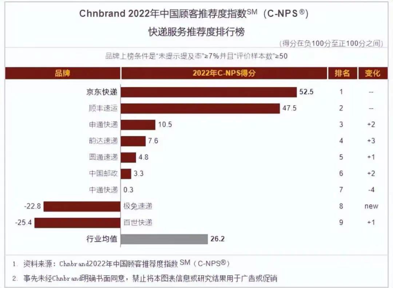 提升服务质量对于极兔也是刻不容缓。从进入中国市场开始,极兔就不断被消费者吐槽。在黑猫投诉平台上,针对极兔的投诉已经有两万多条,投诉的内容包括时效慢、虚假签收、联系不上快递员、快递破损等。快递的寄件方商家因降本需要选择了价格更低的极兔,但收件方是大量的消费者,尽管不直接作为极兔的付费方,但差体验造成的差口碑势必会阻碍企业的长远发展。在2022年初发布的Chnbrand 2022年中国顾客推荐指数快递服务推荐度排行榜中,极兔以-22.8的分数排名倒数第二,倒数第一则是当时极兔刚收购不久的百世快递。