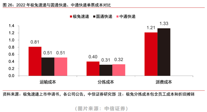 与此同时,极兔在国内的快递物流网络和成本控制还需要进一步提升。经过对百世、丰网的收购,极兔的快递物流网络已较为完善,但对比同行的网络数据,在干线运输自有车辆和线路方面还明显偏弱。而单票收入低于同行的极兔在成本方面并没有比同行更优秀,在中信证券的研报中提到,极兔的单票运输成本0.81元,同时中通、圆通的单票运输成本仅0.51元;极兔的单票分拣成本0.40元,同时中通、圆通的单票分拣成本为0.31~0.32元。无论是在运输方面(转运中心分布、干线路周转率和人效、运输油耗等)还是分拣方面(转运中心人效、自动化分拣设备使用等),极兔的成本控制都还有较大的优化空间。