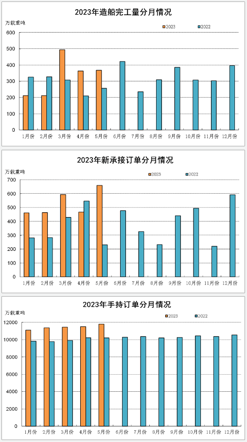 1~5月,48家重点监测的造船企业完工出口船1401万载重吨,同比增长14.1%;承接出口船订单2380万载重吨,同比增长49.7%;5月末手持出口船订单10747万载重吨,同比增长18%。出口船舶分别占重点造船企业完工量、新接订单量、手持订单量的86.9%、94.2%和94.5%。