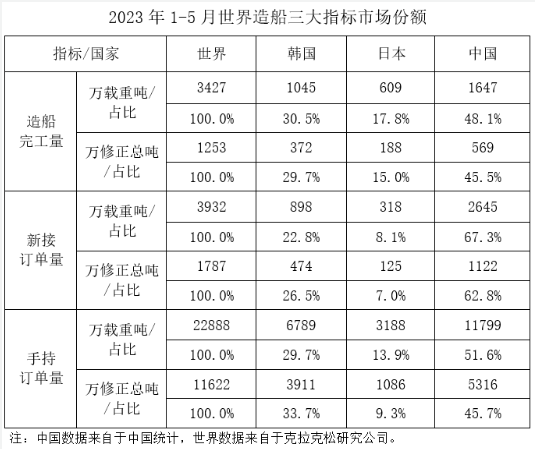 1~5月,我国造船完工量、新接订单量、手持订单量分别占世界市场份额的48.1%、67.3%和51.6%。
