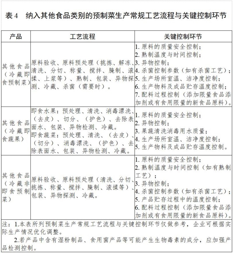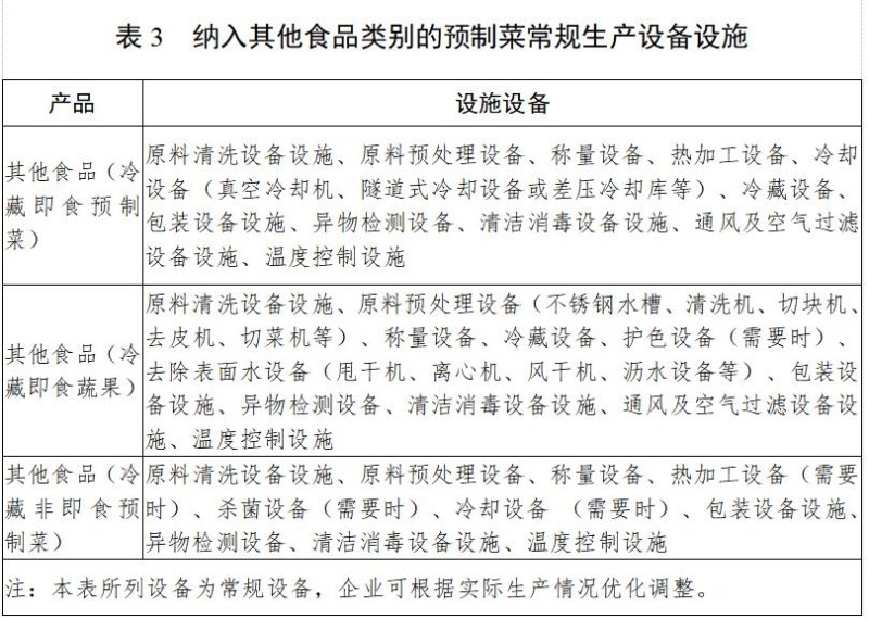 《方案》还对预制菜常规生产设备设施做了罗列,要求生产设备,供排水、消毒、废弃物存放、个人卫生、通风、照明、温控、检验等设施应符合《食品生产许可审查通则》和《食品安全国家标准食品生产通用卫生规范》(GB 14881)的相关规定。