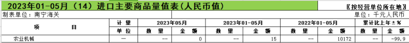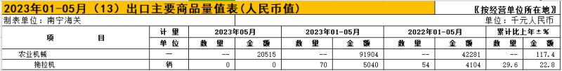 【农机网 市场行情】近日,南宁海关发布2023年1-5月进出口主要商品量值表(人民币值)。其中,农业机械相关情况如下: