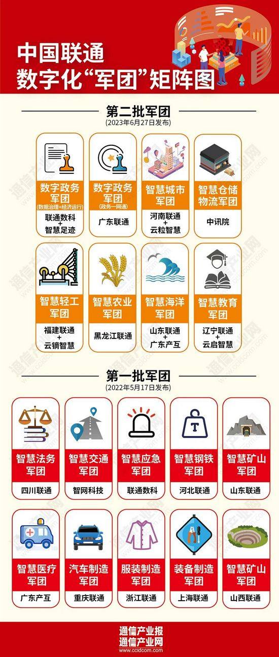 2023年6月27日,在中国联通七一主题党日暨国企开放日上,中国联通发布第二批7个行业8大军团,并集结出征。新的八大军团包括数字政务(数据治理+经济运行)军团、数字政务(政务一网通)军团、智慧城市军团、智慧仓储物流军团、智慧轻工军团、智慧农业军团、智慧海洋军团和智慧教育军团。截至目前,中国联通共发布军团18个,共涉及16行业。