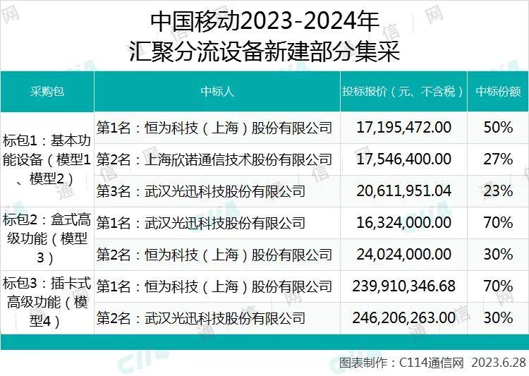 C114讯 6月28日消息(焦焦)从中国移动官网获悉,中国移动今日公示了2023年至2024年汇聚分流设备新建部分的集采结果,恒为、光迅、欣诺三家瓜分。