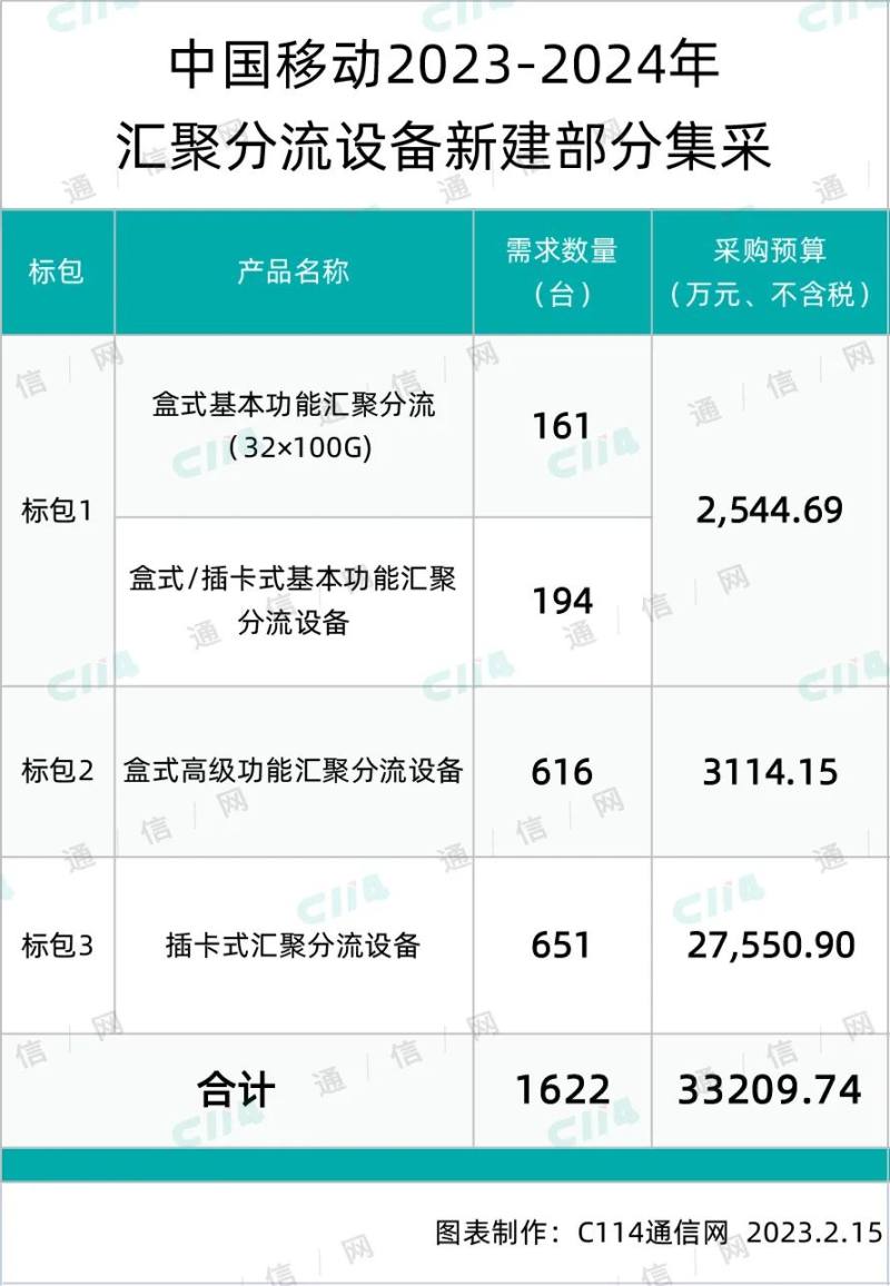 据此前中国移动发布的集采公告显示,本次汇聚分流设备新建部分采购规模为1622台,其中盒式基本功能设备355台;盒式高级功能设备616台;插卡高级功能设备651台。项目总预算为33209.74万元(不含税)。该项目采用混合招标模式,共划分为3个标包,具体标包划分及采购预算见下表: