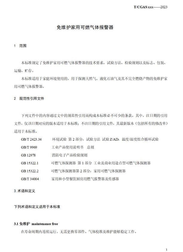 本标准适用于家庭环境使用的,用于探测天然气、液化石油气及其不完全燃烧产物的免维护家用可燃气体报警器。