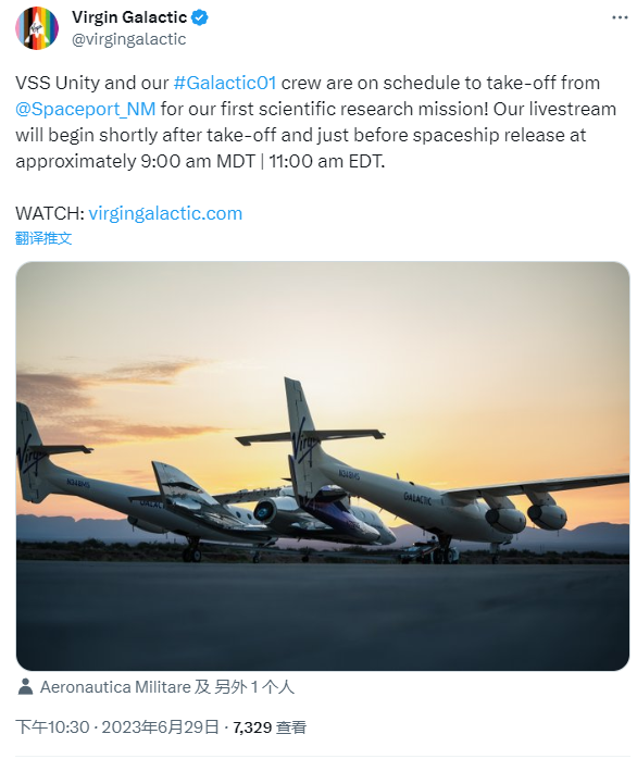 IT之家 6 月 29 日消息,英国富豪理查德・布兰森创建的太空旅游公司维珍银河现宣布:VSS Unity 和 Galactic01 机组人员将在今晚 23 点左右按计划从新墨西哥州美国航天港起飞,进行首次商业太空飞行任务。