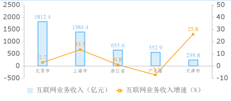 互联网业务累计收入居前 5 名的北京(增长 2.7%)、上海(增长 13.3%)、浙江(增长 0.8%)、广东(下降 7.5%)和天津(增长 25.8%)共完成业务收入 4645 亿元,同比增长 5%,占全国(扣除跨地区企业)比重达 87.5%。全国互联网业务增速实现正增长的省(区、市)有 15 个,其中河北、山东、黑龙江增速超 40%。