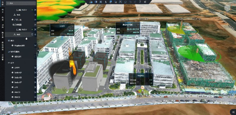 同时,Vothing平台除了支持工程BIM模型外,还实现了对众多元素类型的覆盖,例如工程GIS类数据:倾斜摄影、高程数据、WMTS/WMS/TMS地图服务、kML、矢量SHP等,还有包括建筑白膜、电子围栏、扩散环、全景图、火焰、烟雾、多态线、数据标签、视频标签等用于孪生呈现的元素,用户可以可根据工程的实际需求来选择相应元素进行场景搭建。