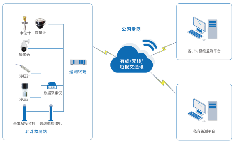 前端监测传感器能够通过有线、无线或短报文通讯方式,按照标准的通讯规约,将监测数据上传到省、市、县级水利监测平台,使水库大坝的安全运行情况一目了然。