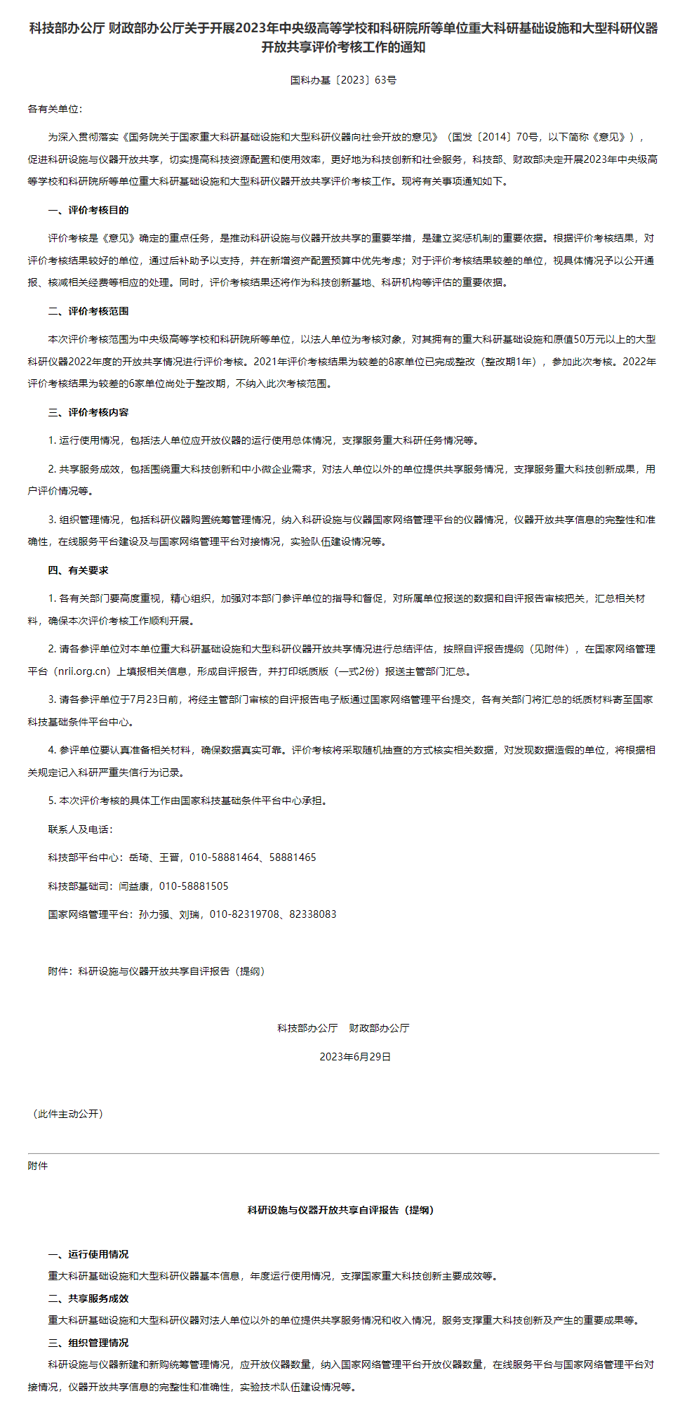 为促进科研设施与仪器开放共享,切实提高科技资源配置和使用效率,更好地为科技创新和社会服务,科技部、财政部决定开展2023年中央级等学校和科研院所等单位重大科研基础设施和大型科研仪器开放共享评价考核工作,发布了《关于开展2023年中央级高等学校和科研院所等单位重大科研基础设施和大型科研仪开放共享评价考核工作的通知》(以下简称《通知》)。
