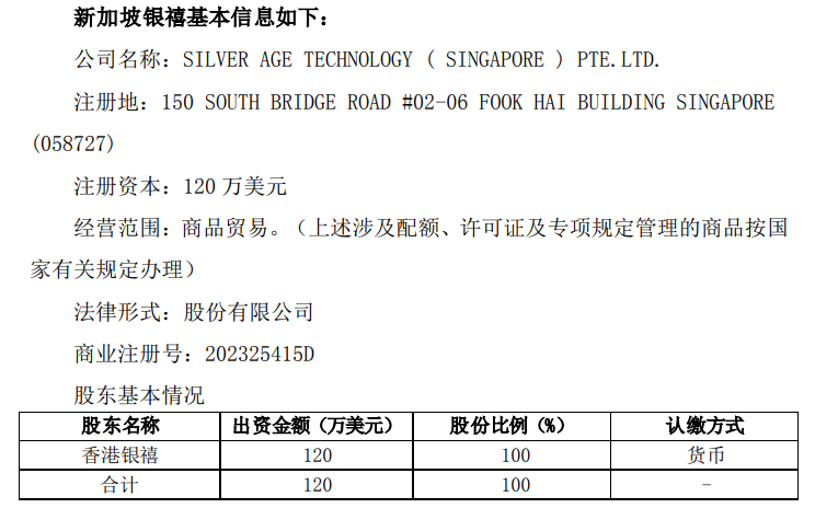 【仪表网 企业动态】广东银禧科技股份有限公司(股票简称:银禧科技,代码:300221)近日接到子公司银禧科技(香港)有限公司(以下简称“香港银禧”)的通知,香港银禧在新加坡设立子公司银禧科技(新加坡)有限公司(SILVER AGE TECHNOLOGY ( SINGAPORE )PTE.LTD.)(以下简称“新加坡银禧”)。新加坡银禧注册资本为120万美元,由香港银禧独资设立。本次对外投资资金来源于香港银禧的自有资金。