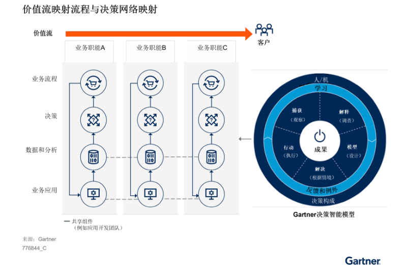 日益复杂的业务场景和瞬息万变的业务环境,给企业带来了前所未有的挑战,如需求难以预测、难以协调不同业务职能部门的工作、用户需求不断增加、市场环境不确定性增加等。在这种情况下,许多企业决心改善决策流程,提高效率和敏捷性,并培养数据驱动型文化。为了打通孤立的业务流程,CIO应使用价值流来串联业务流程,包括关键决策点;借助Gartner决策智能模型来映射关键决策网络。