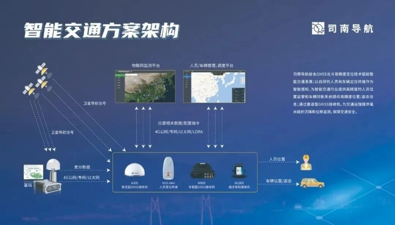 司南导航结合GNSS北斗高精度定位技术赋能智能交通发展;以自研的人员和车辆定位终端作为智能感知,为智能交通行业提供高精度的人员位置监管和车辆控制系统提供高精度位置/姿态信息;通过普适型GNSS接收机,为交通设施提供毫米级的沉降和位移监测,保障交通安全。