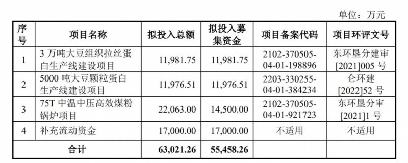 索宝股份本次拟在上交所主板公开发行股票数量不超过4786.48万股,拟募集资金55458.26万元,扣除发行费用后的净额将全部用于3万吨大豆组织拉丝蛋白生产线建设项目、5000吨大豆颗粒蛋白生产线建设项目、75T中温中压高效煤粉锅炉项目、补充流动资金。