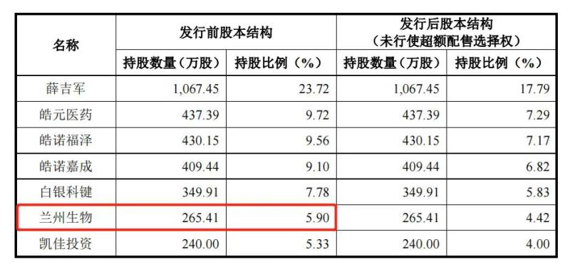 股改后,持股比例超过5%的股东共有7个,包括国有股东兰州生物,持有265.41万股,持股比例5.90%。前三大股东为薛吉军、皓元医药、皓诺福泽,对应持股比例为23.72%、9.72%、9.56%。