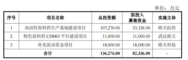 此次冲刺科创板,皓天科技计划发行不超过1500万股,占发行后总股本不低于25%,募集资金8.23亿元。其中,5.33亿元用于“高活性原料药生产基地建设项目”、1.10亿元用于“特色原料药CDMO平台建设项目”,剩下的1.80亿元用于“补充流动资金项目”。
