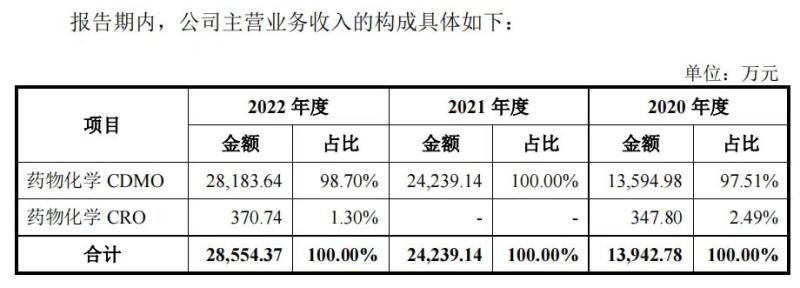 报告期内,CDMO业务几乎贡献了全部的主营收入,分别为1.34亿元、2.42亿元、2.82亿元,占比为97.51%、100%、98.70%。CDMO产品包括但不限于SNAC系列(糖尿病药物口服药物促渗透剂)、骨化醇系列、前列腺素系列。