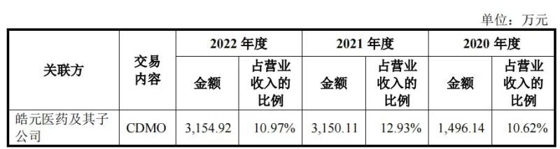 2020-2022年,皓天科技与6个关联方产生关联交易,其中唯一的重大关联交易,就是与皓元医药发生的。报告期内,皓天科技向皓元医药及其子公司销售CDMO商品,金额为1496.14万元、3150.11万元和3154.92万元,分别占营业收入的10.62%、12.93%和10.97%。