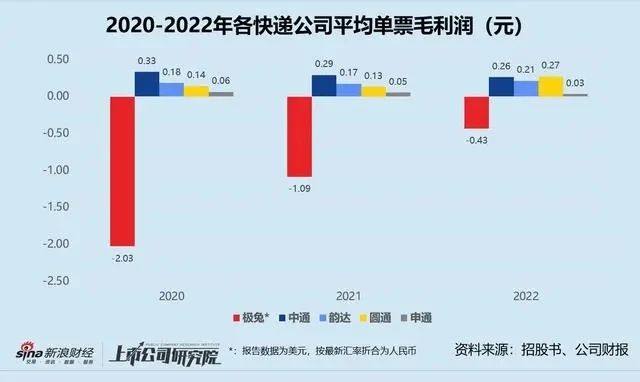 按现阶段汇率换算,2022年速递平均每单亏损0.4元。相比之下,“三通一达”在同报告期内,韵达和圆通单票毛利同比分别提高23.53%、107.69%,全员实现盈利。