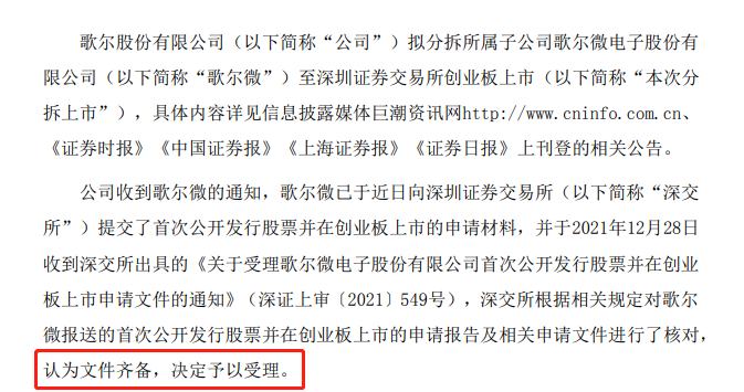 12月29日,歌尔股份公告称,关于分拆所属子公司歌尔微电子股份有限公司(简称“歌尔微”)至创业板上市申请已获得深交所受理。12月28日披露的招股书显示,本次分拆完成后,歌尔股份仍将维持对歌尔微的控制权,歌尔微仍为歌尔股份合并报表范围内的子公司。同时,歌尔股份也提醒称,本次分拆上市尚需满足多项条件方可实施,包括但不限于通过深圳证券交易所审核及中国证券监督管理委员会同意注册等,存在重大不确定性。