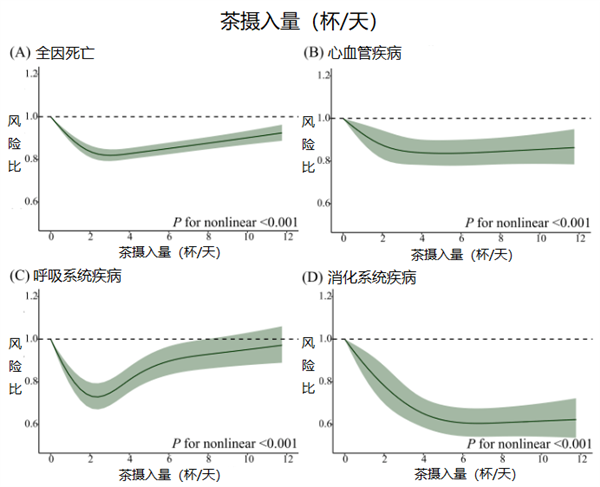 关于喝茶,学者们也发现:“只喝茶”与全因、心血管疾病和消化系统疾病死亡率之间呈反 J 型关联,与呼吸系统疾病死亡率之间存在 J 型关联。