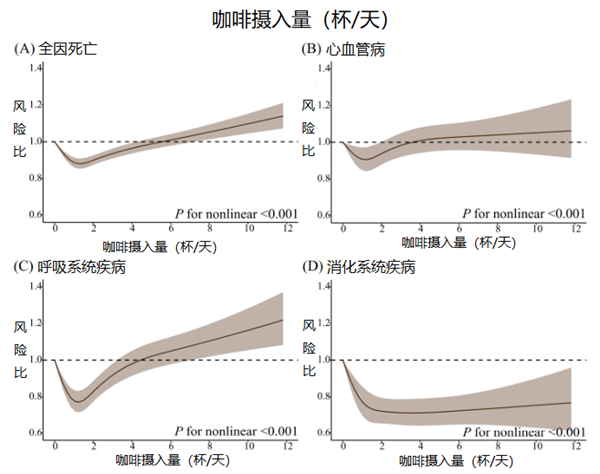 来自天津医科大学的学者们发现:“只喝咖啡”和全因死亡、心血管疾病和呼吸系统疾病死亡率之间存在 J 型关联,和消化系统疾病死亡率之间存在反 J 型关联。