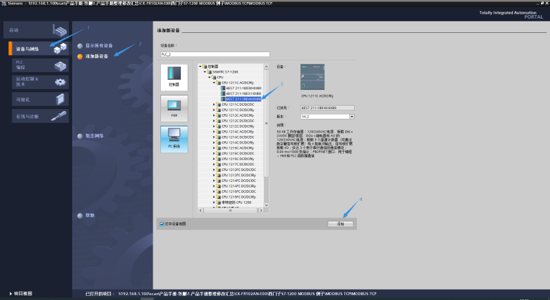 2、点击设备与网络添加新设备,选择对应的PLC型号进行添加,本次以:CPU1211CAC/DC/PLY,6ES7211-1BE40-0XB0为例。