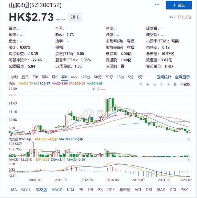 目前,山航B退股票已定格在了最后交易日的收盘价2.73港元/股,与其2015年创造的历史最高价31.2港元/股相比,已跌去九成。