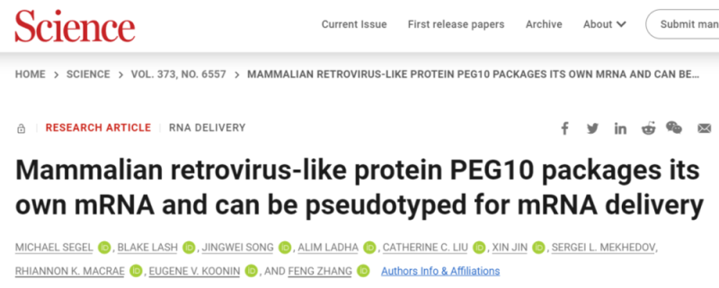 2021年8月19日,张锋团队在Science发表论文[11]。该研究开发了一种全新的RNA递送平台——SEND,其核心是逆转录病毒样蛋白PEG10,它能够与自身的mRNA结合并在其周围形成球型保护囊。SEND系统利用人类内的组分自组装为病毒样颗粒,能够用来包装和递送RNA。与其他递送载体相比,其引起的免疫反应更少,更具安全性。