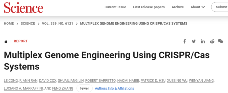 2013年1月3日,张锋作为通讯作者在Science期刊发表了一篇题为:Multiplex Genome Engineering Using CRISPR/Cas Systems的研究论文,首次将CRISPR-Cas9技术应用于人类细胞基因编辑。这篇论文让这位年仅30岁的华人学者一鸣惊人,并在此后十年间引领了基因编辑发展和应用的潮流。