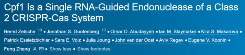 2015年9月25日,张锋团队在Cell期刊发表论文[6],该研究发现并表征了一种新型CRISPR系统——Cpf1(后更名为Cas12a),Cas12a相比Cas9更简洁,而且其切割DNA后会产生粘性末端切口,因此更适合用来进行基因插入。