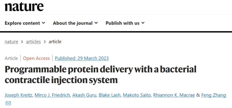 2023年3月29日,张锋团队在Natrue期刊发表论文[15]。该研究通过AlphaFold辅助蛋白质设计开发了一种蛋白质递送系统——改造、利用独特的细菌“注射器”将蛋白质注射到人类细胞中。这种新型蛋白质递送方式或将改变基因治疗、癌症治疗等前沿疗法格局,具有强大的应用前景。
