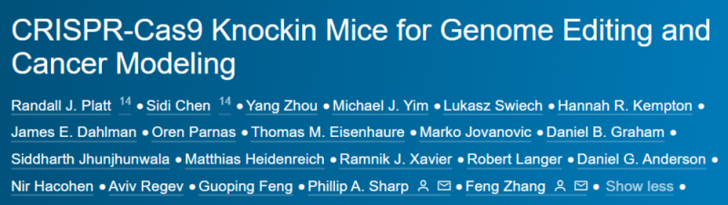 2014年9月25日,张锋团队在Cell期刊发表论文[4],该研究构建了一种Cre依赖性Cas9基因敲入小鼠模型,用于基因编辑和癌症建模研究,这项研究表明Cas9基因敲入小鼠模型广泛的生物学和疾病建模应用。