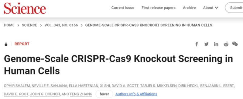 2013年12月12日,张锋团队在Science期刊发表论文[3],该研究构建了一个慢病毒递送的全基因组CRISPR基因筛选文库,并使用该文库发现了多个与黑色素瘤耐药性相关的基因。该研究证明了Cas9在全基因组规模筛选中的应用前景。