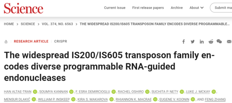 2021年9月6日,张锋团队在Science期刊发表论文[12],该研究发现了一类广泛的转座子编码的RNA引导核酸酶,并将其命名为OMEGA系统(包括IscB、IsrB、Tnp8)。该系统被认为是CRISPR-Cas9的祖先。OMEGA系统使用一段RNA来指导切割DNA双链,即ωRNA。更重要的是,这些核酸酶很小,仅为Cas9的大约30%,这意味着它们可能更容易被递送到细胞中。