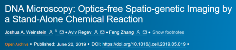 2019年6月20日,张锋团队在Cell期刊发表论文[9],该研究开发了这一种独特成像方式的DNA显微镜,不依赖光或任何类型的光学器件,其成像能力完全来自扩散分子动力学,将物理图像编码为DNA,并以精确的序列信息推断细胞分辨率的原始转录物的物理图像,从而实现在基因组水平上对细胞的观察。