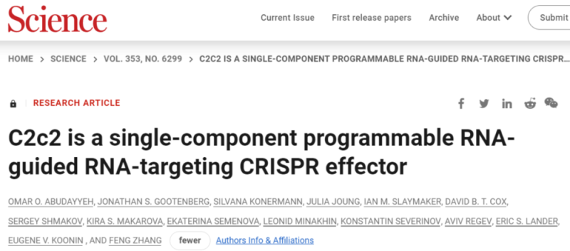 2016年6月2日,张锋团队在Science期刊发表论文[7],该研究发现并表征了一种新型CRISPR系统——C2c2(后更名为Cas13a),Cas13a能够靶向编辑RNA,这一发现拓宽了我们对CRISPR-Cas系统的理解,表明了Cas13a可作为一种RNA靶向编辑工具。