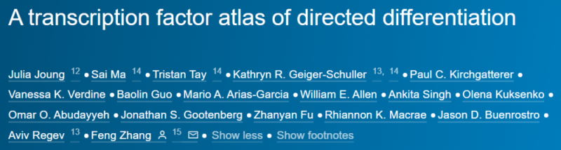 2023年1月5日,张锋团队在Cell期刊发表了论文[14]。该研究创建了一个涵盖了人类所有转录因子异构亚型(共3548个)的条形码文库,并将其用于构建转录因子图谱(TF Atlas),以单细胞分辨率绘制了每个转录因子过表达在人类胚胎干细胞(hESCs)中引起的表达谱变化。这个全面的转录因子图谱既可以系统地识别驱动细胞状态变化的转录因子,也可以对孤儿转录因子进行分类等研究,还可以用来预测和验证不同转录因子组合对细胞的影响。