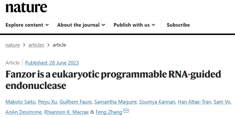 2023年6月28日,张锋团队在Nature期刊发表论文[16]。该研究在真核生物中发现了第一个RNA引导的DNA切割酶——Fanzor,更重要的是,这种新型CRISPR样系统,可以在重编程后实现对人类基因组的编辑。相比CRISPR-Cas系统,Fanzor系统非常紧凑,更容易递送到细胞和组织中。而且,Fanzor系统没有旁系切割活性,可实现更精准的基因组编辑。这项最新研究也提示我们,RNA引导的DNA切割机制存在于所有生物界。