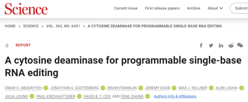 2019年7月12日,张锋团队在Science期刊发表论文[10]。该研究开发了一种RNA单碱基编辑器——RESCUE,利用dCas13,可以将RNA上的特定位点由C变成U。该系统极大地扩展了CRISPR技术在RNA编辑领域的应用。