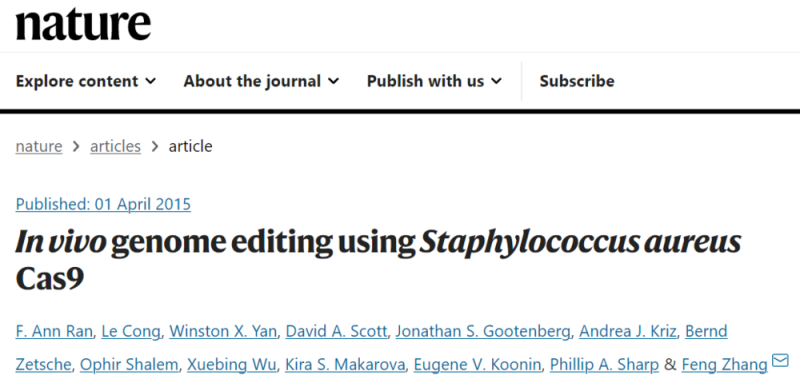 2015年4月1日,张锋团队在Nature发表论文[5],该研究发现了来自金黄色葡萄球菌的Cas9——saCas9,相比之前广泛应用的来自化脓链球菌的spCas9,saCas9尺寸更小,能够通过腺相关病毒(AAV)进行递送,实现体内基因编辑。