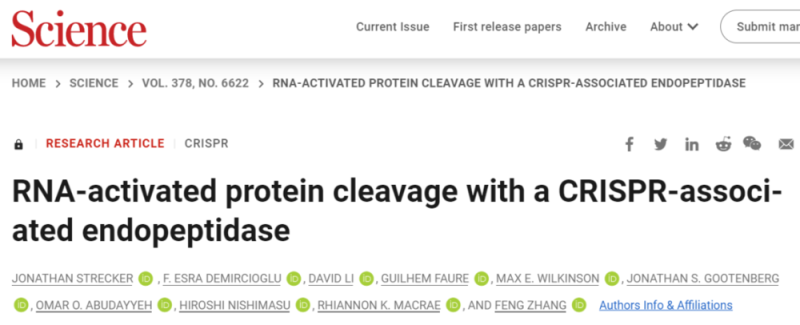 2022年11月3日,张锋团队在Science期刊发表论文[13]。该研究确定了Cas7-11这种III-E型CRISPR相关蛋白酶(CASP)的蛋白底物、结构和作用机制,揭示了CRISPR系统除了作为核酸酶,还可以切割蛋白质,并开发了可在体外和人类细胞中用于检测RNA的RNA传感。
