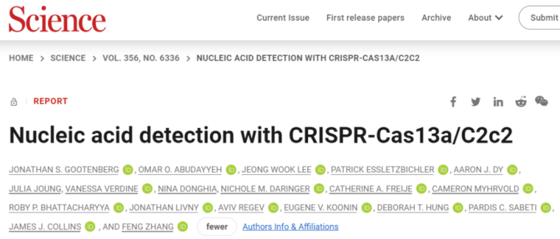 2017年4月13日,张锋团队在Science期刊发表论文[8],该研究发明了一种基于CRISPR-Cas13a的病毒检测技术——SHERLOCK,这一与神探夏洛克·福尔摩斯同名的检测技术,可以让被切割的RNA形成条带,形成视觉可见的线索,并直观展示出来。