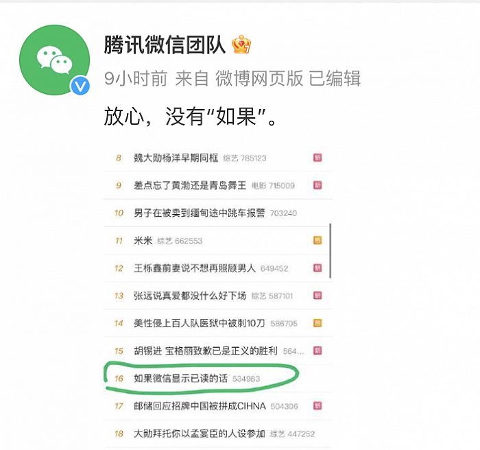 让打工人心头一紧的“已读”会在微信显示吗?今日,话题“如果微信显示已读的话”登上微博热搜榜,对此,腾讯微信团队在官方微博回应称,“放心,没有‘如果’”。