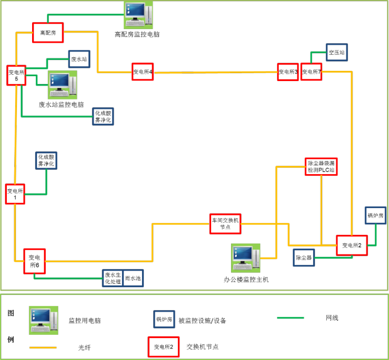 根据工厂实际情况进行组网,如系统结构图所示:该能源管理系统设置一套能源主机和两套能源区域分机,根据各个区域的权限进行能源监视和管理。