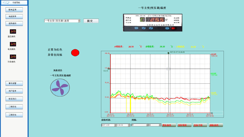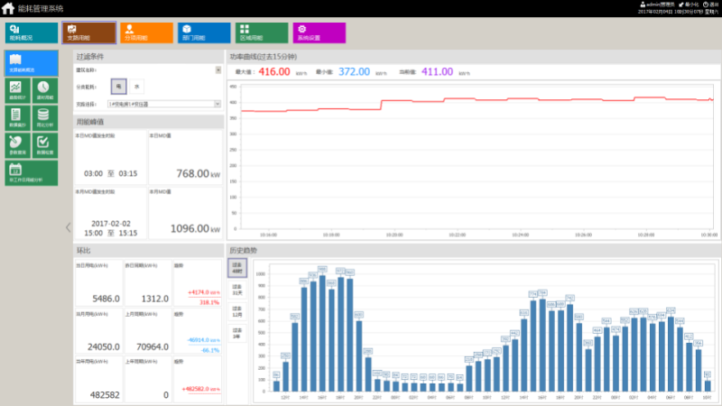 该能源管理系统能够以配电一次干线图的形式直观显示配电线路的分布情况,同时将实时采集的各回路的电参量信息,以及配电回路开关的分合闸状态,接地刀闸状态及相关故障、告警信号,实时显示在系统界面中。